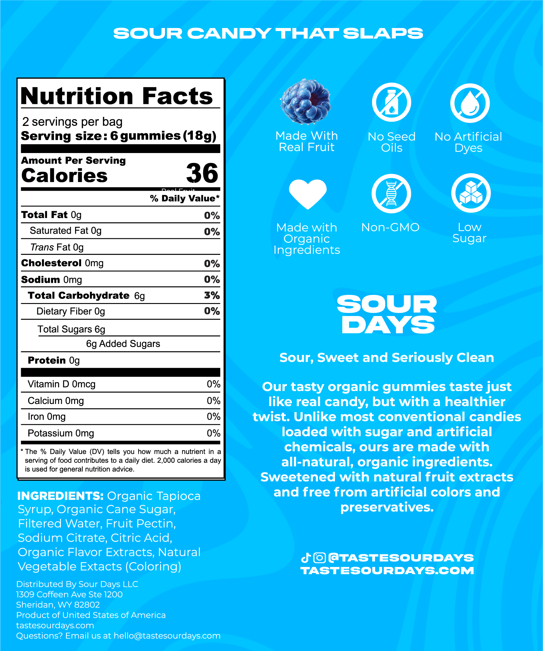 Our Organic Sour Blue Raspberry gummies taste just like real candy—but with a better, healthier twist. Made with organic ingredients, naturally sweetened with fruit extracts, and free from artificial colors and preservatives. Organic, Non-GMO, Gluten-Free, and Vegan—all the flavor, none of the junk!