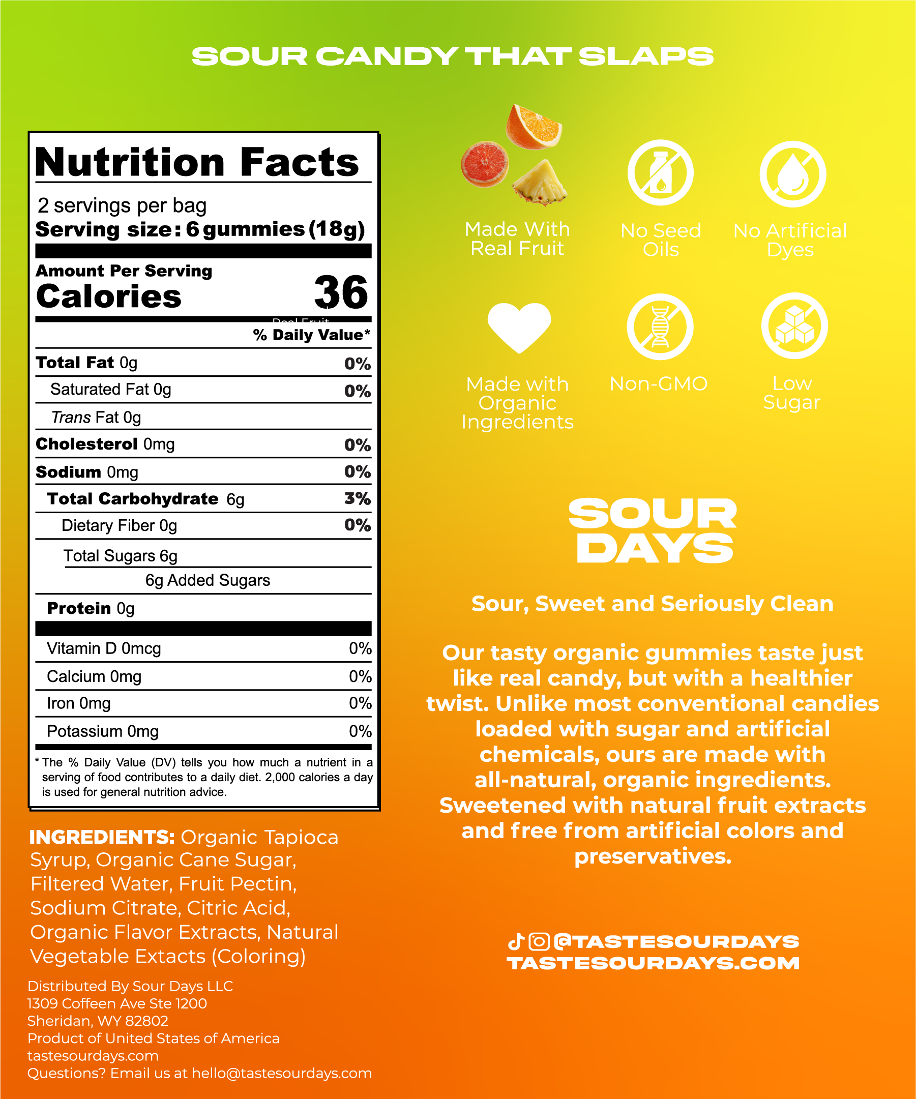 Our Organic Sour Citrus Sunrise gummies taste just like real candy—but with a better, healthier twist. Made with organic ingredients, naturally sweetened with fruit extracts, and free from artificial colors and preservatives. Organic, Non-GMO, Gluten-Free, and Vegan—all the flavor, none of the junk!